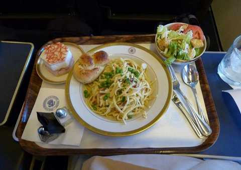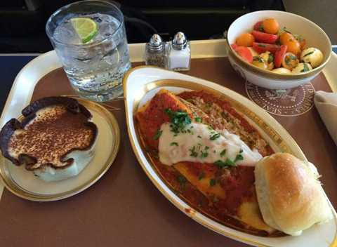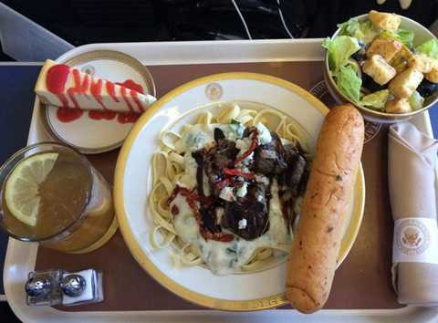 | Trang ABC News cho biết, tất cả những đồ gốm được sử dụng trên "phòng Bầu dục bay" đều được dán nhãn con dấu của Tổng thống Mỹ. Những chiếc đĩa hoặc cốc thủy tinh sứt mẻ sẽ bị tiêu hủy, để các đồ vật này không bị lấy cắp hoặc bán ra ngoài. Trong hình là bữa tối gồm có món salad Caprese với húng quế tươi và món Lasagna nhân thịt bò. Ngoài ra còn một tách tiramisu để tráng miệng. |