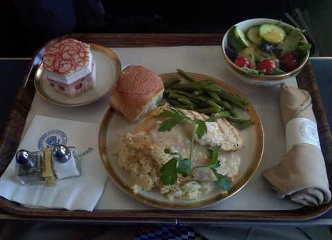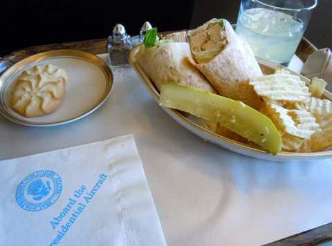 | Các đầu bếp trên chuyên cơ của Tổng thống Mỹ luôn tạo ra một thực đơn độc đáo cho mỗi chuyến bay của Không lực Một phù hợp với khẩu vị của Tổng thống. Trong hình là một bữa trưa kiểu Mexico gồm bánh Taco cuộn thịt gà, salad ăn kèm khoai tây chiên, dưa chua và một cốc nước chanh kiểu Không lực Một. |