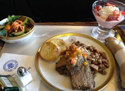 | Các đầu bếp trên Không lực Một chuẩn bị các bữa ăn tại Căn cứ Không quân Andrew luôn có một gia vị bí mật để ướp các loại thịt nướng trên máy bay. Trong hình là miếng thăn bò nướng được ăn kèm với sốt cà chua tươi, đậu đỏ ninh nhừ, bánh mì chiên tỏi, salad rau củ và một cốc kem hoa quả. |