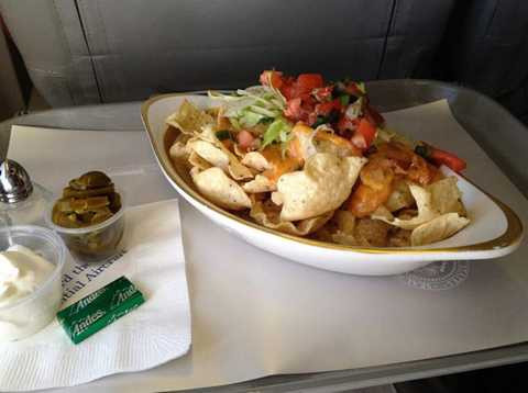| Trong các chuyến bay ngắn, các đầu bếp sẽ chuẩn bị các món ăn nhẹ hoặc để sẵn đồ ăn vào hộp. Ảnh: Món bánh khoai tây rán dùng với sốt phô mai cay, salad cà chua Pico de Gallo và rau diếp thái nhỏ. |