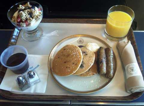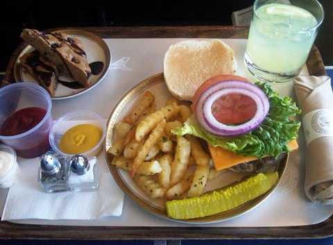 | Các bữa ăn trên Không lực Một đều rất thịnh soạn và giàu calo. Đối với các phụ tá Tổng thống, thành viên phi hành đoàn, các mật vụ và nhân viên truyền thông, một bữa ăn trên máy bay của Tổng thống cũng đủ năng lượng cho cả ngày. Ảnh: Một bữa ăn nhẹ với xúc xích, bánh rán và nước ép hoa quả. |