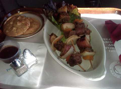 | Các đầu bếp trên Không lực Một có thể chuẩn bị bất cứ thứ gì mà Tổng thống hoặc gia đình ông yêu cầu trên suốt chuyến bay. Nếu Tổng thống muốn một chiếc bánh burger phô mai thay vì những đồ ăn có sẵn trong thực đơn, họ có thể lập tức làm cho ông. Ảnh: Thịt xiên nướng |