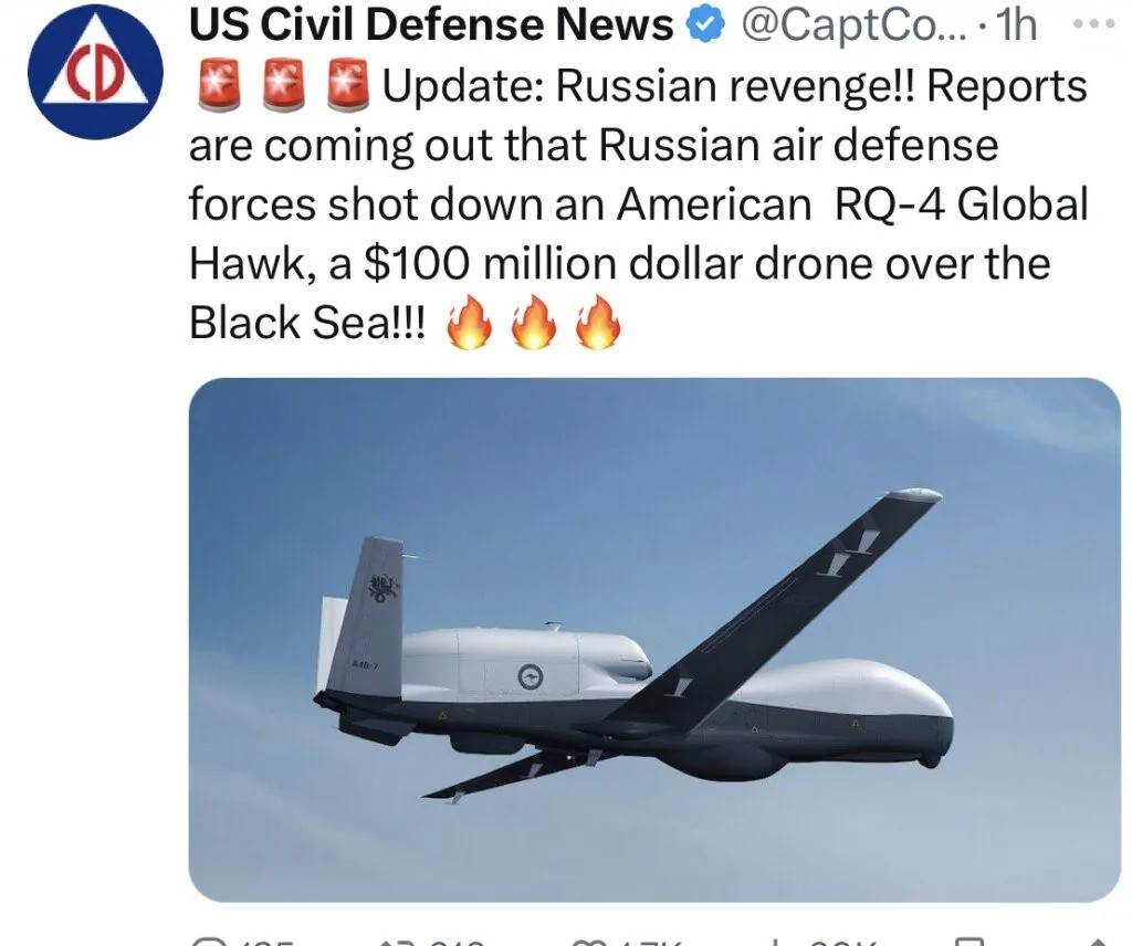 US Civil Defense News viết trong X là: “Cập nhật: một chiến đấu cơ MiG-31 của Nga đã bắn hạ máy bay RQ-4B Global Hawk của Mỹ trên biển Đen gần Crimea, khi chiếc máy bay không người lái do thám của Mỹ đang tìm kiếm và cung cấp thông tin mục tiêu cho tên lửa NATO ở Ukraine”.