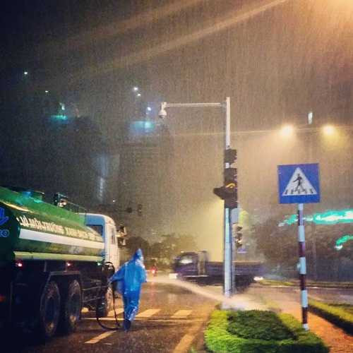 Một người dân ở Hà Nội đã chụp được bức ảnh ghi lại cảnh công nhân miệt mài tưới cây dưới trời mưa tầm tã. Bức ánh được cho là chụp vào khoảng 12h đêm 4/8 tại khu vực ngã tư Huỳnh Thúc Kháng - Nguyễn Chí Thanh.