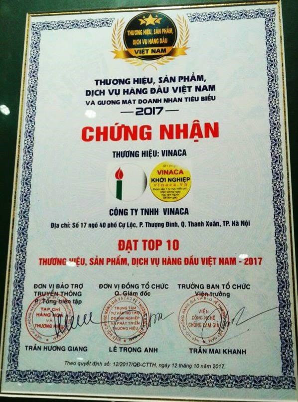 Trong lần trao giải năm 2017, Vinaca là một trong những doanh nghiệp được vinh danh vì những thành quả đã đạt được. Bên cạnh Vinaca, top 10 Thương hiệu, Sản phẩm, Dịch vụ hàng đầu Việt Nam 2017 không chỉ gói gọn con số “10” mà được nhân lên con số hàng trăm doanh nghiệp được tôn vinh.