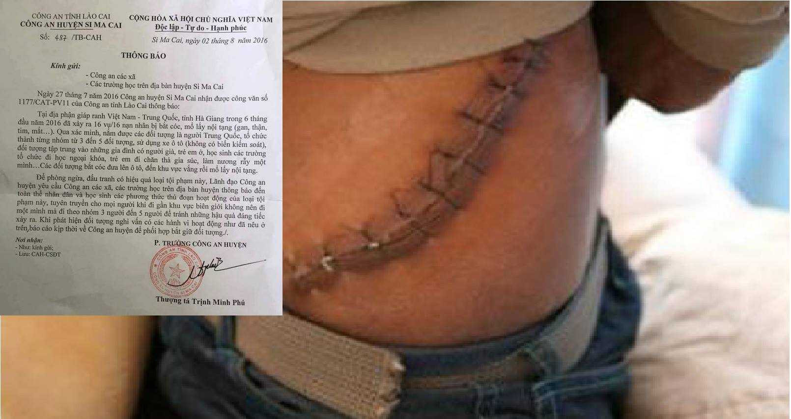 Ngày 10/8, trên mạng xã hội lan truyền công văn số 487/TB-CAH của Công an huyện Si Ma Cai, Lào Cai do Thượng tá Trịnh Minh Phú, Phó Trưởng Công an huyện này ký với nội dung cảnh báo hiện tượng tội phạm bắt cóc, mổ lấy nội tạng người tại vùng biên giới Việt Nam - Trung Quốc.
