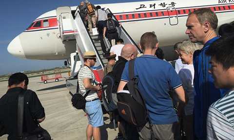 | Du khách nước ngoài lên một máy bay của Air Koryo ở sân bay quốc tế Bình Nhưỡng. Ảnh: AP |