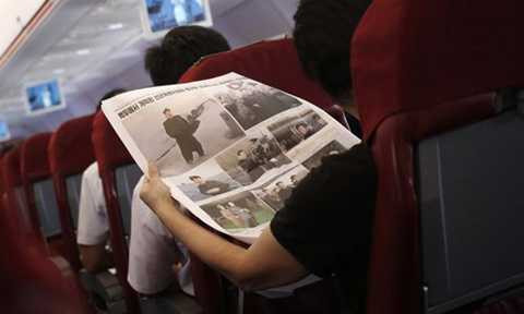 | Hành khách đọc tờ báo đăng nhiều hình ảnh của lãnh đạo Triều Tiên Kim Jong-un trên chuyến bay của Air Koryo khởi hành từ Bình Nhưỡng. Ảnh: AP |