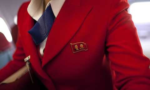 | Tiếp viên trên một máy bay của Air Koryo mang huy hiệu in hình hai cố lãnh đạo Triều Tiên Kim Nhật Thành và Kim Jong-il. Ảnh: AP |