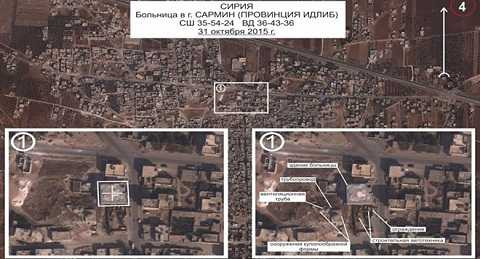 Những hình ảnh vệ tinh được công bố trong cuộc họp báo cho thấy bệnh viện Sarmin, trước đó bị cho là đã bị phá hủy hoàn toàn, vẫn nguyên vẹn, không hề hư hại sau cuộc không kích của Nga, trái ngược với đoạn video do kênh truyền hình CNN của Mỹ đăng trước đó về một tòa nhà bị phá hủy.