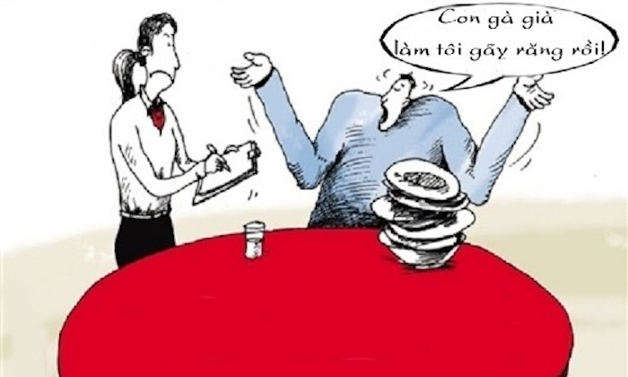 - Này ông chủ, con gà này thế nào mà vừa già vừa cứng, ăn gãy cả răng!