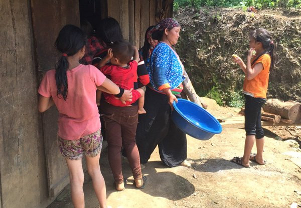 Ngôi nhà gỗ lợp phibroximăng khá rộng, người đàn bà béo tốt đội mũ vải sặc sỡ, nhưng cởi trần đang hái rau. Thấy khách lạ, nhưng bà cứ thong thả mặc kệ, mãi sau chúng tôi đề nghị chụp ảnh bà mới đi tìm áo để mặc. Trong bếp, một “cụ bà” đang dúi những thanh củi vào bếp, nấu nồi cơm to tướng. Lít nhít quanh nhà là bọn trẻ, to nhỏ lớn bé dễ đến hai chục, đuổi nhau, trèo cây tíu tít như đàn chim rừng.