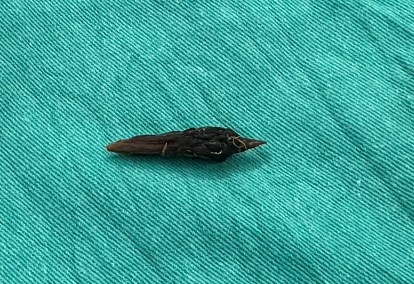 Bệnh nhân cũng được hút rửa sạch toàn bộ ổ bụng. Khi phẫu thuật mở rộng để kiểm tra tổn thương đoạn cuối ruột non, bác sĩ phát hiện một lỗ thủng trên thành ruột, tại đây có một dị vật sắc nhọn chọc ra ngoài. Sau khi lấy dị vật ra, xác định đó là hạt táo đỏ khô.