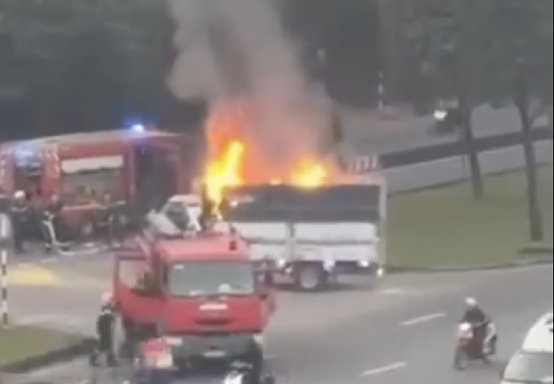 Clip xe tải bốc cháy khi đang chạy trên đường. (Nguồn: PC07)