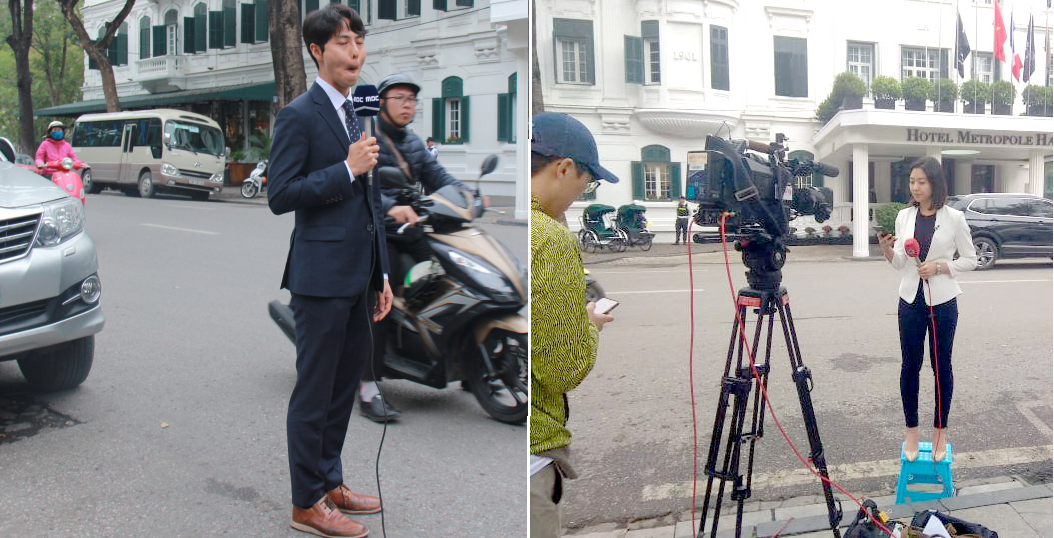 Nữ phóng viên HanjiEe của kênh Yonhap News TV (Hàn Quốc) đang ghi hình với lời dẫn bằng tiếng Anh lưu loát. (Ảnh: Mạnh Đoàn)