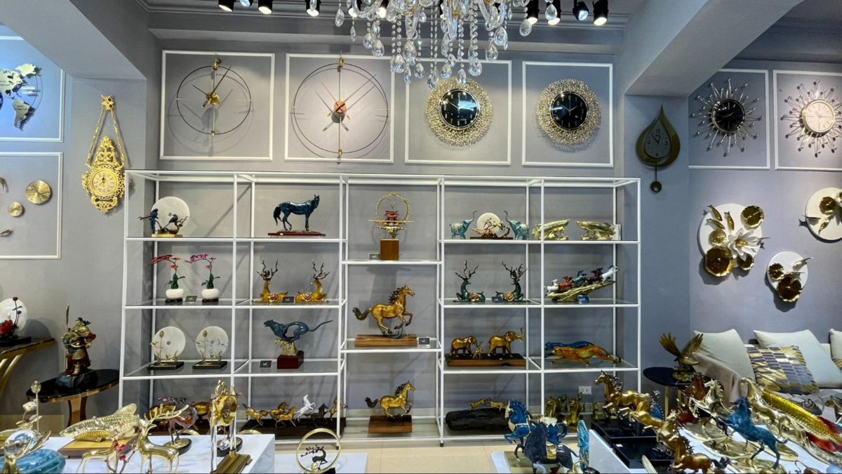 Showroom cửa hàng trưng bày hàng nghìn sản phẩm với mẫu mã, kiểu dáng, chất liệu đa dạng như: gương decor, đồng hồ, decor để bàn, decor treo tường, bàn Console, tranh Canvas, lọ hoa… Trong đó, những sản phẩm độc đáo như linh vật quà tặng bằng đồng nguyên chất mạ vàng (ngựa bát mã, bò phố Wall) hay những bức tranh treo tường cao cấp bằng đồng, bằng vàng… nhận được sự yêu thích đặc biệt của nhiều khách hàng.