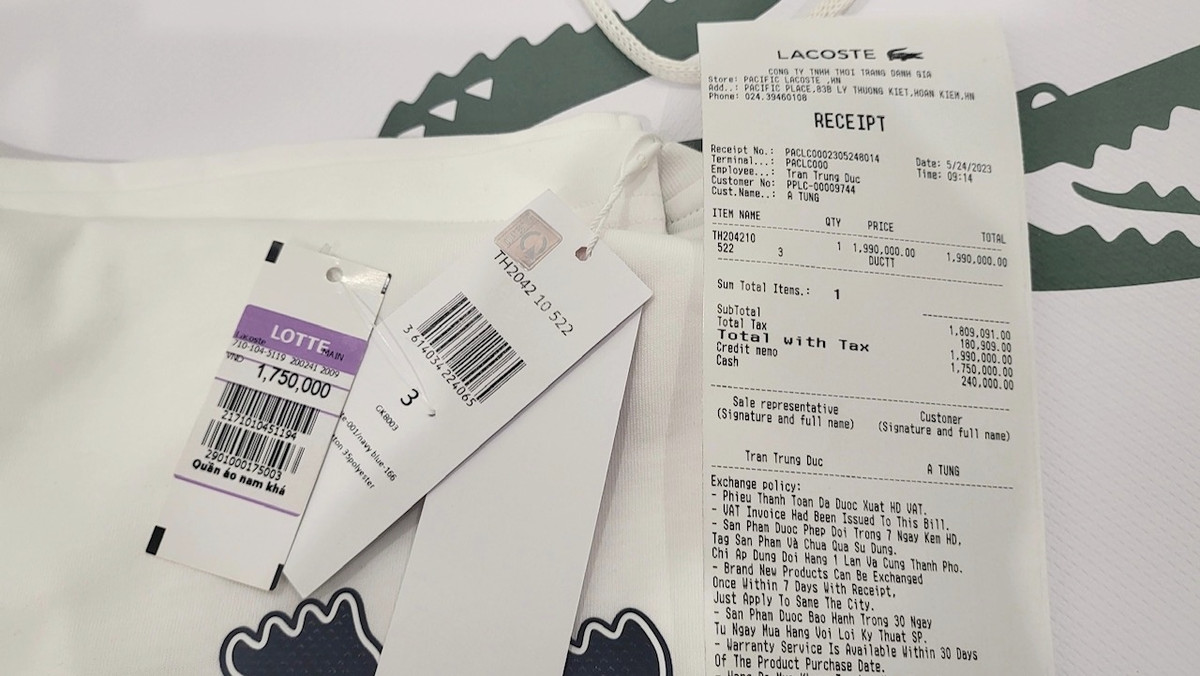 Anh T, khách quen của thương hiệu thời trang Lacoste cho biết, ngày 24/5, anh ghé vào cửa hàng của Lacoste ở Pacific Place đường Lý Thường Kiệt (quận Hoàn Kiếm, TP Hà Nội) để mua áo thun. Thấy chiếc áo cổ tròn giá 1,75 triệu đồng, anh T quyết định chọn mua. Khi đến quầy thanh toán, nhân viên thông báo anh T phải trả số tiền 1,99 triệu đồng.
