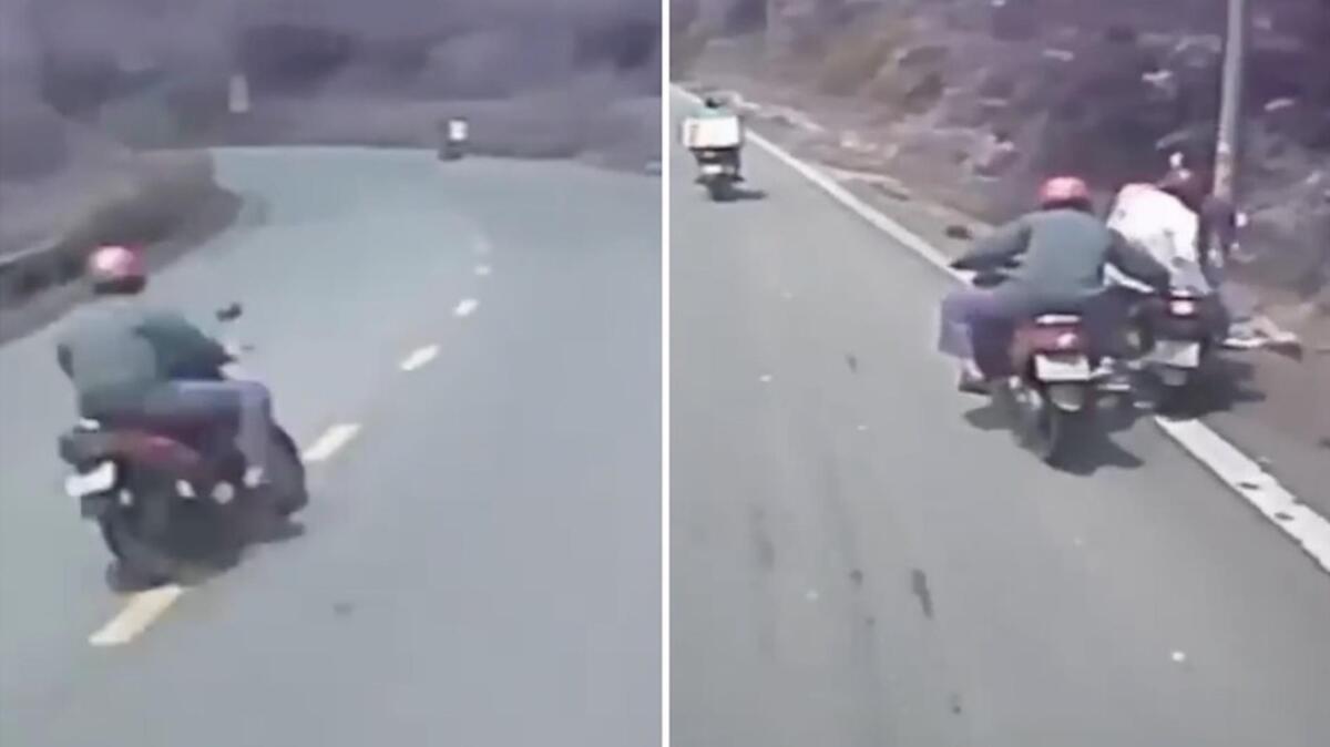 Anh Đinh Văn Chiến đuổi theo chiếc xe máy bị mất phanh đang lao vun vút trên đèo Tam Đảo, dùng tay kéo lại để cứu thành công 3 người ngồi trên xe. (Ảnh cắt từ clip)