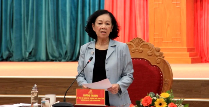 Sau nội dung báo cáo của Tỉnh uỷ Bình Định về công tác xây dựng đảng, xây dựng hệ thống chính trị từ sau Đại hội Đảng bộ tỉnh Bình Định lần thứ XX đến nay, bà Trương Thị Mai, Ủy viên Bộ Chính trị, Thường trực Ban Bí thư, Trưởng Ban Tổ chức Trung ương đã đánh giá cao sự nỗ lực của Ban Thường vụ Tỉnh ủy, Tỉnh ủy Bình Định trong công tác xây dựng đảng, hệ thống chính trị và phát triển kinh tế - xã hội, giữ vững quốc phòng an ninh.