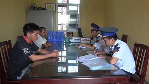 | 2 đối tượng (bên trái) chở dầu lậu tại cơ quan CSB lấy lời khai phục vụ công tác điều tra làm rõ |