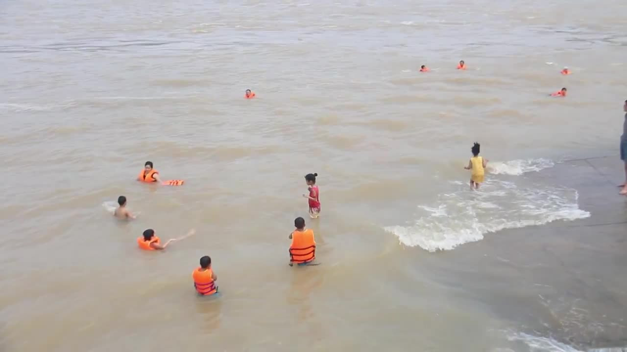 Đập thủy điện Hòa bình đang xả cửa đáy, người dân thành phố Hòa Bình nô nức đưa trẻ em ra tắm 2 bên đập bất chấp nguy hiểm.