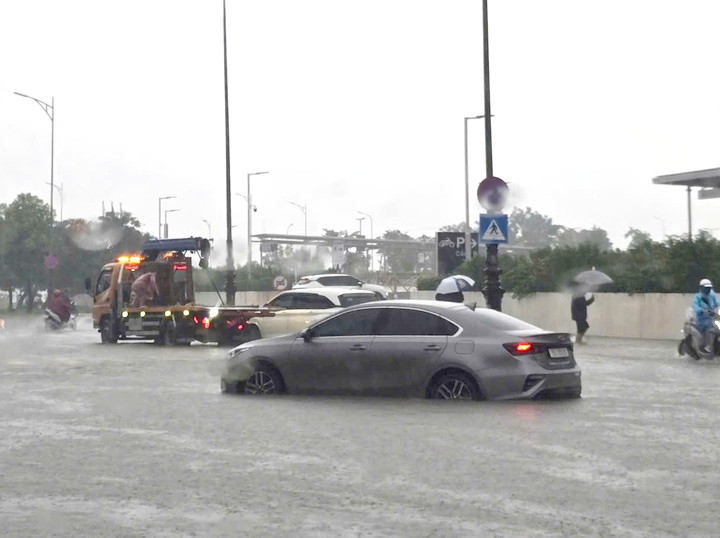 Nhiều ô tô đi qua đoạn đường bị ngập gần Trung tâm Thương mại AEON MALL Huế bị chết máy, phải gọi cứu hộ