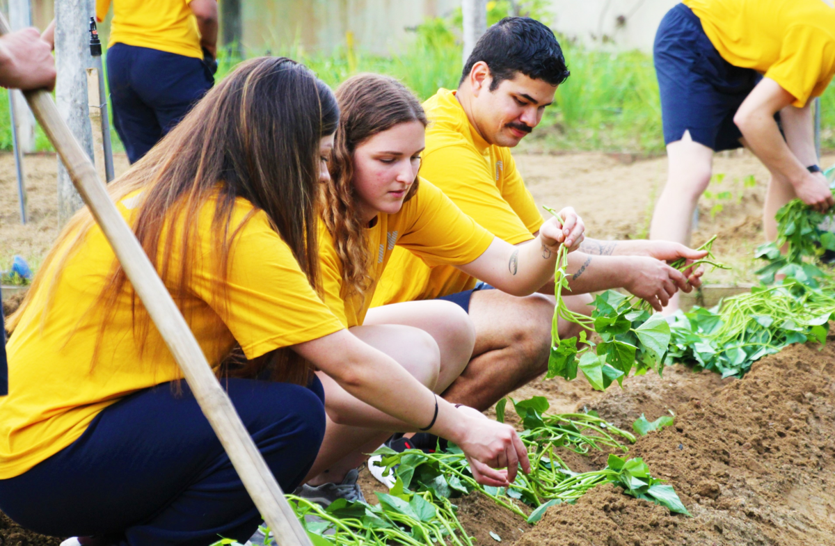 Thủy thủ tàu CVN-71 cuốc đất trông rau tại Trung tâm Trung tâm Bảo trợ nạn nhân chất độc da cam và trẻ em bất hạnh TP Đà Nẵng.