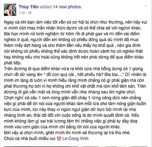 Thuỷ Tiên chia sẻ: “Ngay cả khi bạn làm việc tốt vẫn có cơ hội bị chửi như thường, nên hãy vui vì mình còn may mắn nhận thức được và có thể chia sẻ với người khác.