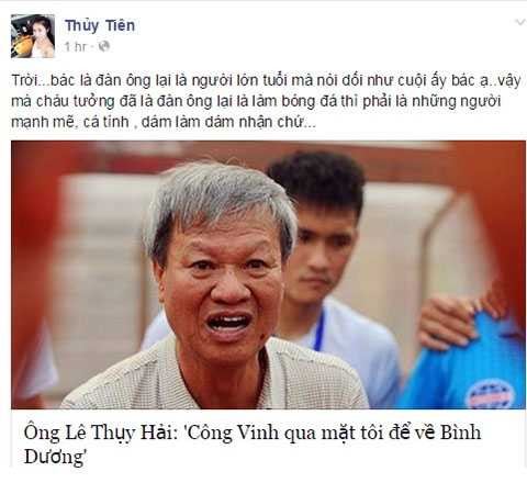 Trước phát biểu này của HLV Lê Thụy Hải, ca sỹ Thủy Tiên – vợ Công Vinh – đã có phản ứng rất mạnh mẽ. Trên trang Facebook cá nhân, Thủy Tiên đã đáp trả lại nhà cầm quân người Hà Đông với những lời lẽ đanh thép.