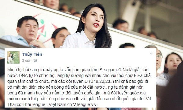 Trên trang cá nhân của mình, Thủy Tiên đã có chia sẻ khá dài về SEA Games cũng như đội tuyển U22 Việt Nam sau thất bại thảm hại khiến khán giả nước nhà không khỏi thất vọng vào ngày 24/8. Mở đầu chia sẻ, nữ ca sĩ đặt câu hỏi vì sao đến thời điểm hiện tại, nhiều người vẫn quan tâm đến SEA Games.