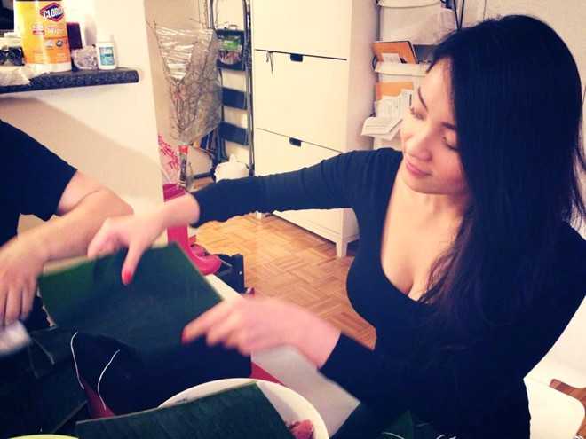 Vài giờ trước, Thủy Top chia sẻ trên trang cá nhân hình ảnh đang tất bật gói bánh chưng, chuẩn bị Tết.