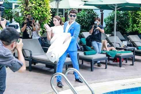 | Khương Ngọc tinh nghịch bế bổng Thuỷ Top và chạy về hướng bể bơi khiến nữ diễn viên gốc Hà Thành bất ngờ. |