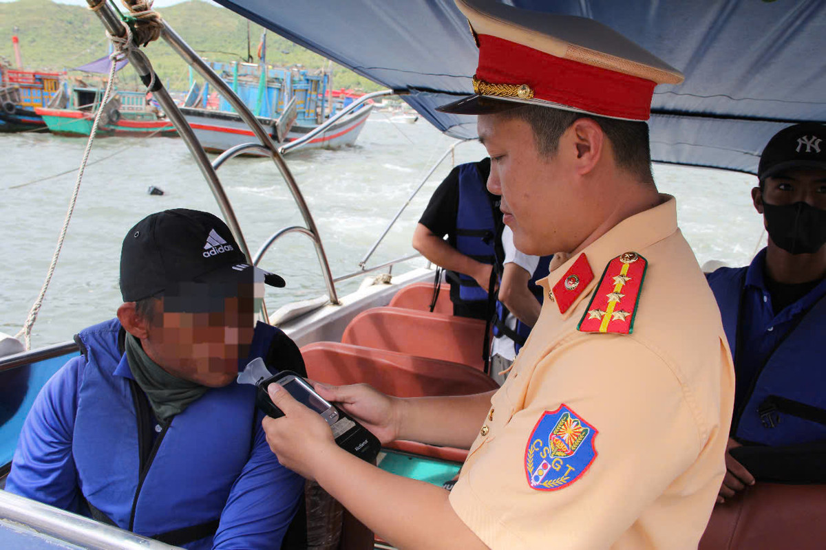 Tiếp theo, tổ công tác kiểm tra nồng độ cồn đối với thuyền trưởng tàu KH-02XX, đang chuẩn bị đưa gần 20 hành khách ra tham qua vịnh Nha Trang. Kết quả kiểm tra, thuyền trưởng không vi phạm nồng độ cồn, tuy nhiên phương tiện này không bố trí đủ thuyền viên đi cùng. Vì vậy cảnh sát đường thủy đã đình chỉ phương tiện, và yêu cầu chủ tàu mời toàn bộ hành khách lên bờ.