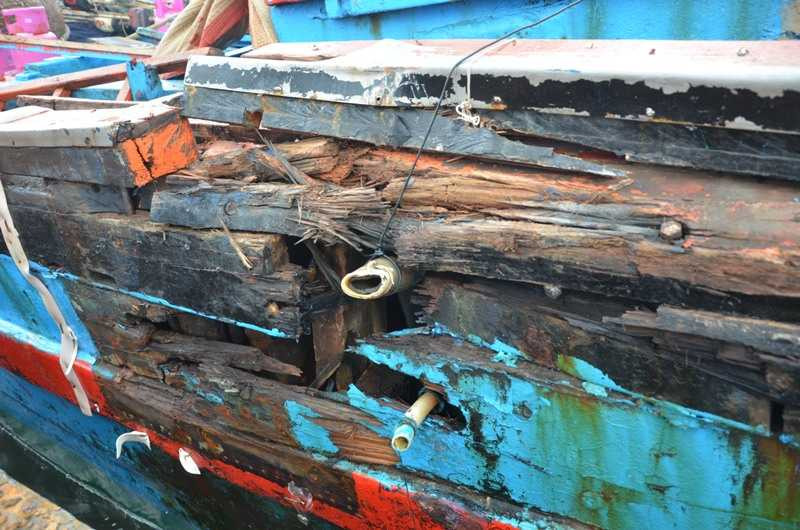 Ông Thạch cho biết sau đó các ngư dân bơi lại được và trèo lên tàu. Tuy nhiên, con tàu đã bị sụp đổ hoàn toàn phần cabin và buồng lái. Máy chính bị hỏng, thân tàu bị thủng khiến nước tràn vào nên con tàu chìm từ từ xuống nước.
