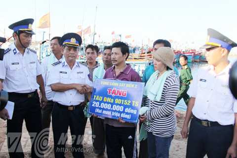 | Đại tá Trần Văn Dũng, chính ủy Cảnh sát biển Vùng 2 tặng quà cho chủ tàu cá ĐNa 90152 |