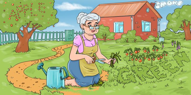 Bức tranh bà lão đang làm vườn có 4 từ tiếng Anh được "viết" bằng các chi tiết khác nhau. Bạn hãy tìm ra chúng.