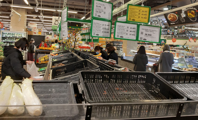 Quầy rau, củ ở siêu thị trên phố Trần Đăng Ninh, quận Cầu Giấy lúc 13h ngày 3/2. (Ảnh: Phạm Nga)