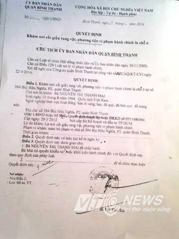 Cũng theo ông Kiên, khi khám xét tiệm vàng Hoàng Mai, lực lượng cảnh sát kinh tế có đưa ra văn băn “khám nơi cất giấu tang vật, phương tiện vi phạm hành chính” do bà Nguyễn Thị Thu Hà - chủ tịch UBND quận Bình Thạnh ký vào ngày 23/4.