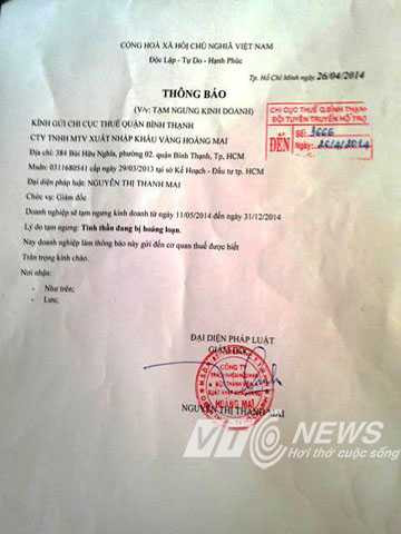 Ngày 26/4, Công ty TNHH MTV xuất nhập khẩu vàng Hoàng Mai đã có thông báo gửi đến Chị cục thuế quận Bình Thạnh về việc tạm ngưng hoạt động. Theo thông báo thì tiệm vàng này sẽ tạm ngưng kinh doanh bắt đầu từ ngày 11/5 đến ngày 31/12/2014, với lý do "tinh thần đang bị hoảng loạn".