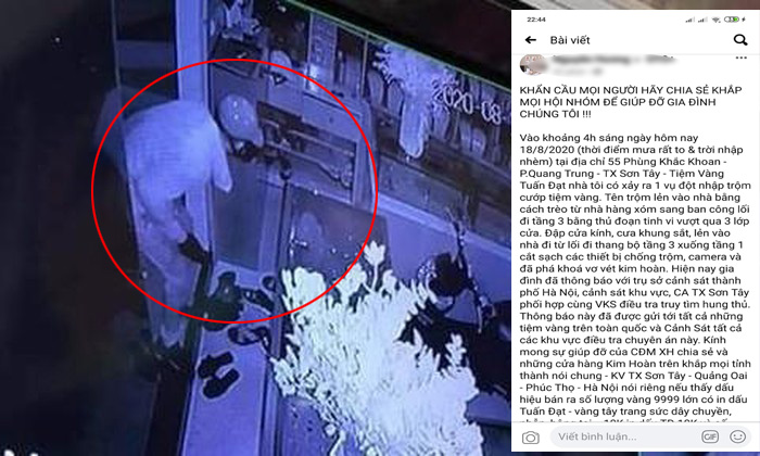 Theo nội dung chị V.A chia sẻ, vào 3h ngày 18/8, lợi dụng trời mưa gió, tên trộm trèo lên nhà hàng xóm rồi đu sang ban công tầng 3 của tiệm vàng. Sau đó, kẻ này phá hai lớp khóa trên tầng 3, đi xuống tầng 1 ngắt điện hệ thống an ninh rồi lấy 350 cây vàng với 140 triệu đồng tiền mặt, ước tính tổng trị giá 13 tỷ đồng.