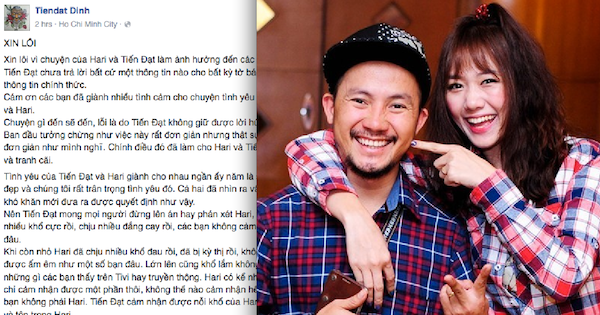 Anh mở đầu những dòng chia sẻ bằng một lời xin lỗi: 'Xin lỗi. Xin lỗi vì chuyện của Hari và Tiến Đạt làm ảnh hưởng đến các bạn. Tiến Đạt chưa trả lời bất cứ một thông tin nào cho bất kỳ tờ báo nào. Đây là thông tin chính thức.