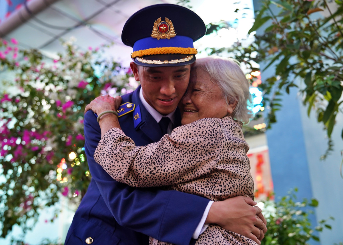 Cụ bà 82 tuổi ở TP Biên Hòa (Đồng Nai) bịn rịn ôm một chiến sĩ thuộc khối Sỹ quan Cảnh sát biển chuẩn bị lên tàu. Cụ bà cho biết đã chờ từ chiều để được tiễn các chiến sĩ. "Khi xem những hình ảnh diễu binh xúc động trong ngày 30/4, tôi đã khóc. Tôi chỉ muốn nói rằng nhân dân miền Nam rất yêu quý các chiến sĩ", cụ bà nói.