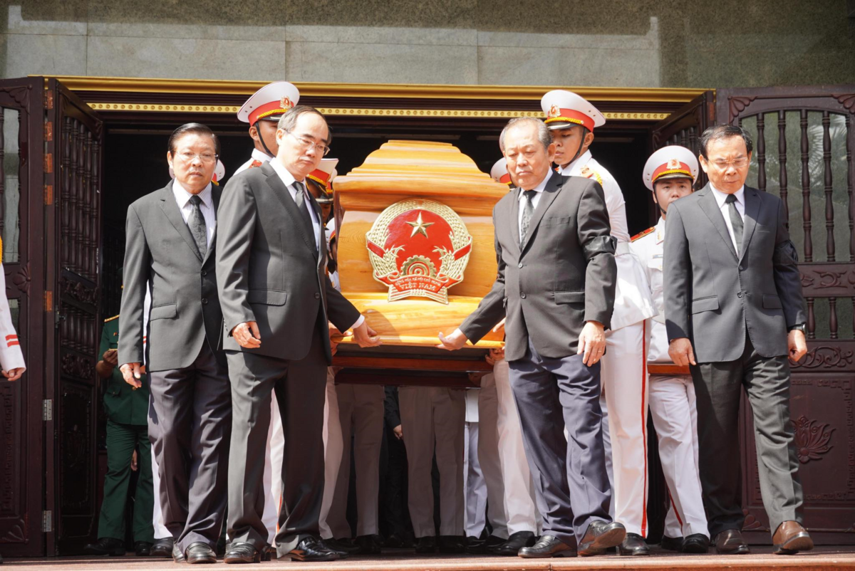 Sau lễ truy điệu, nghi thức di quan được cử hành trang nghiêm, đưa linh cữu ông Trần Quốc Hương đi an táng tại nghĩa trang thành phố ở Quận 9.