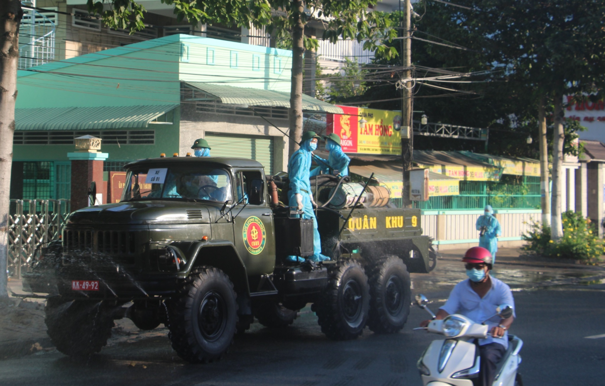 Phun khử trùng trên các tuyến đường tại TP Mỹ Tho. (Ảnh: C.H)