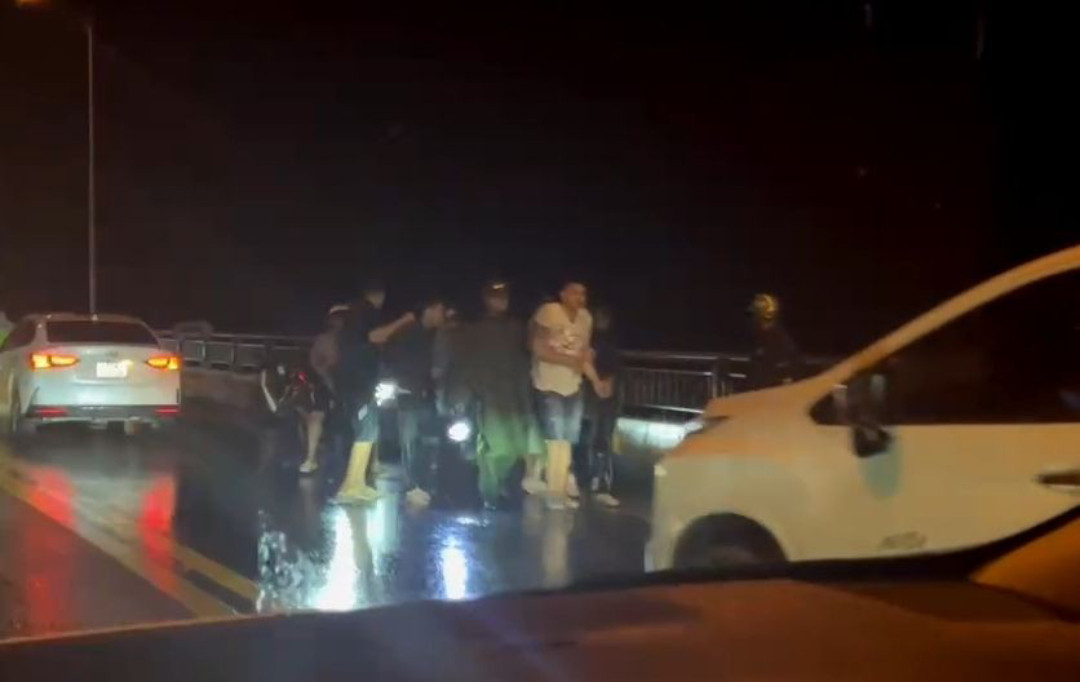 Lực lượng công an bắt giữ 31 thanh niên trên cầu Rạch Miễu. (Ảnh: Thảo Vy)