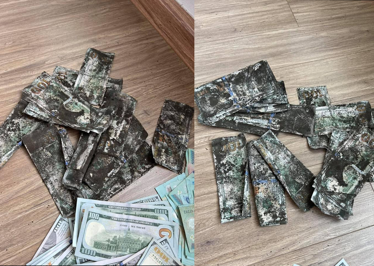 Cụ thể, một hình ảnh được chia sẻ trên mạng xã hội kèm lời chú thích “Hai năm mới đập heo, gặp ca này xử lý sao các bạn?” đã nhanh chóng trở thành chủ đề bàn tán rôm rả. Hai bức ảnh cho thấy giữa một xấp tiền đô và Việt lẫn lộn, nổi bần bật một nhúm giấy gần như bị phủ khắp một lớp chất bẩn đen kịt.