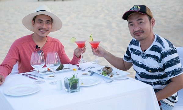 Sau khi đắm mình thỏa thích trong làn nước mát lạnh, Kiều Minh Tuấn và Tiến Luật được ngư dân chiêu đãi thưởng thức những con nhum tươi sống.