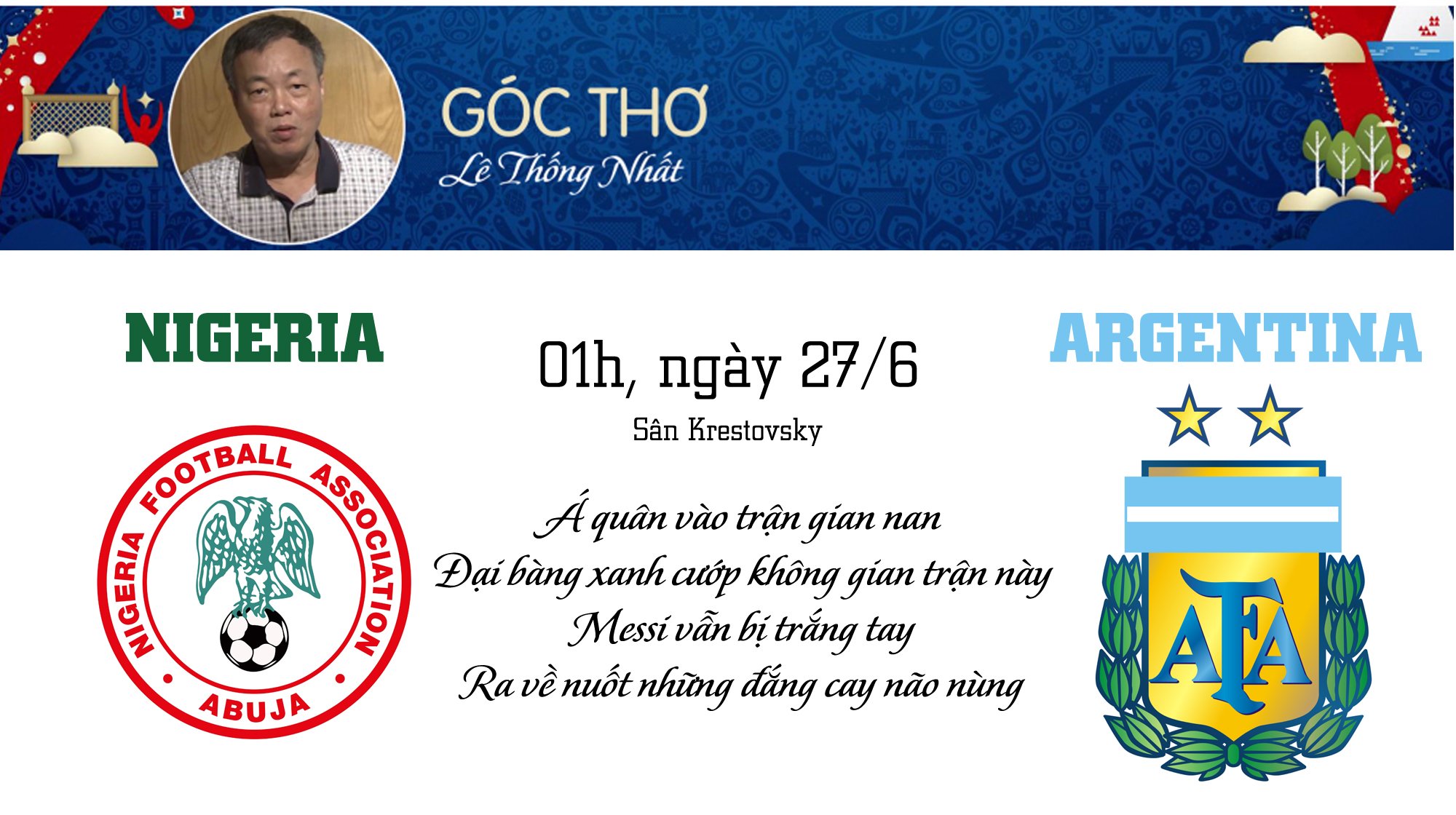 26/06/2018 09:23:00 +07:00Tiến sĩ Lê Thống Nhất dự đoán Messi và Argentina tiếp tục trắng tay để rồi 'ra về nuốt những đắng cay não nùng'