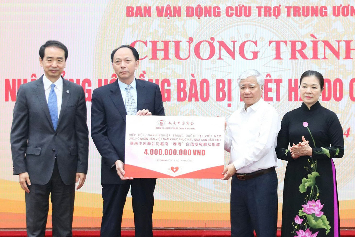 Chủ tịch Ủy ban Trung ương Mặt trận Tổ quốc Việt Nam Đỗ Văn Chiến tiếp nhận ủng hộ từ Hiệp hội Doanh nghiệp Trung Quốc tại Việt Nam, chiều 20/9. (Ảnh: mattran.org.vn)