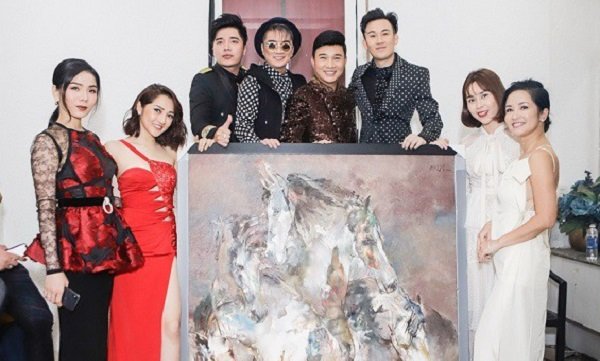 Đàm Vĩnh Hưng và các nghệ sĩ chụp ảnh lưu niệm với bức tranh của nghệ sĩ Hứa Thanh Bình.